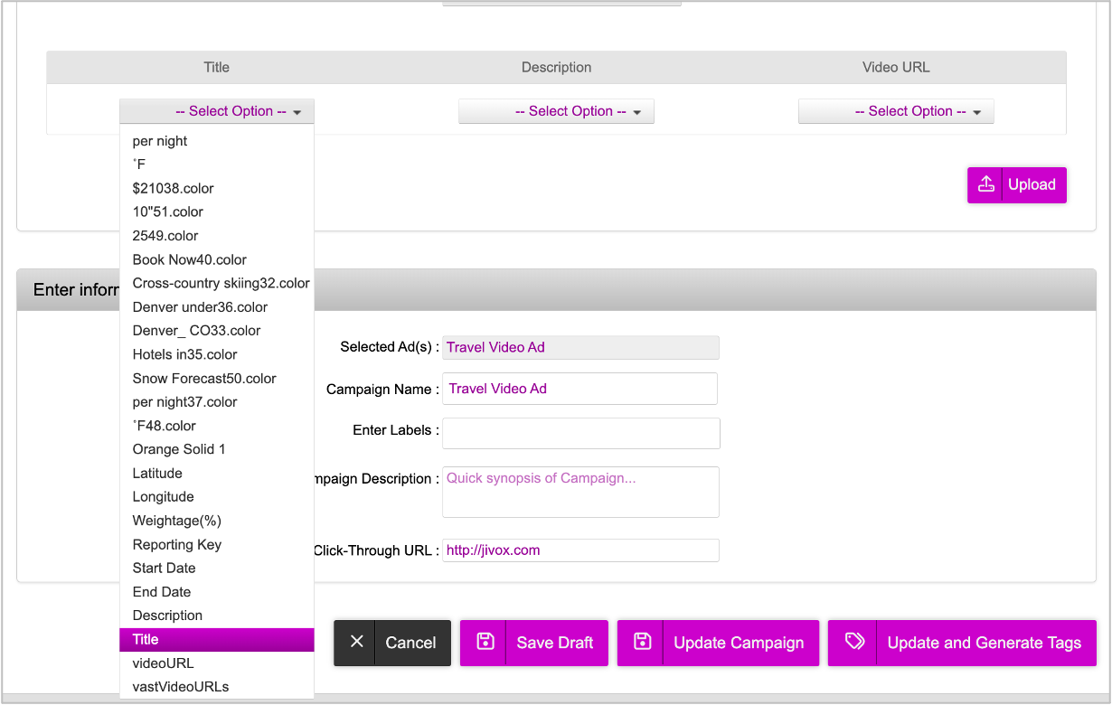 8- Next, under Video URL, click the drop-down icon and select videoURL from the list.