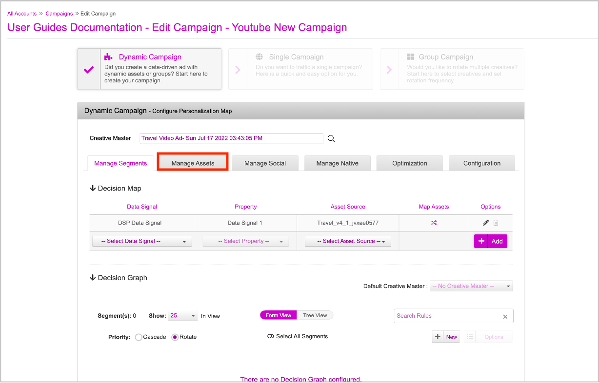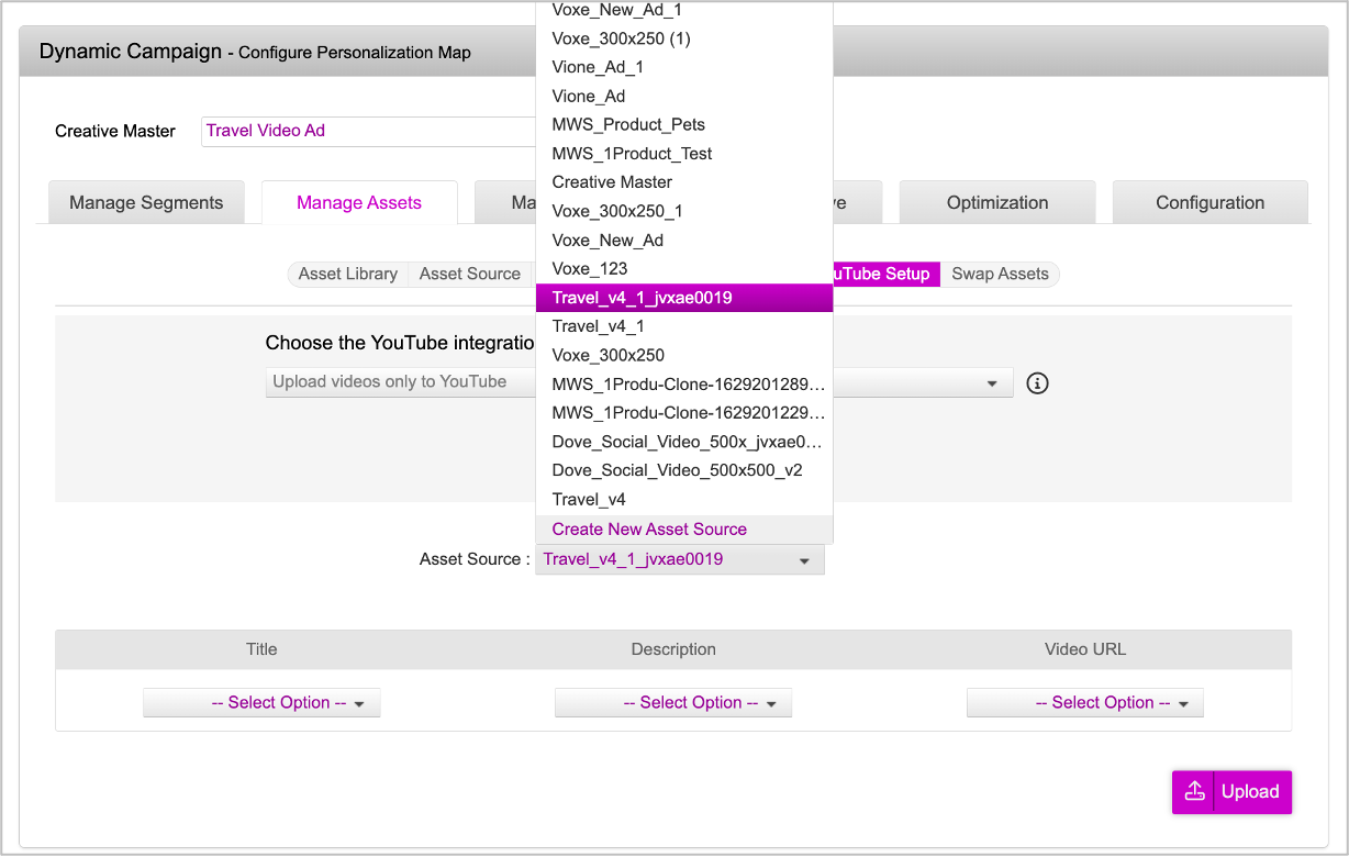 5- Next we'll go ahead and select the appropriate Asset Source that was created while creating the Ad. Ensure that the system generated Asset Source is selected here.