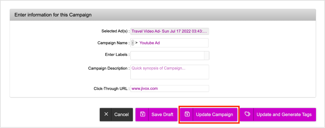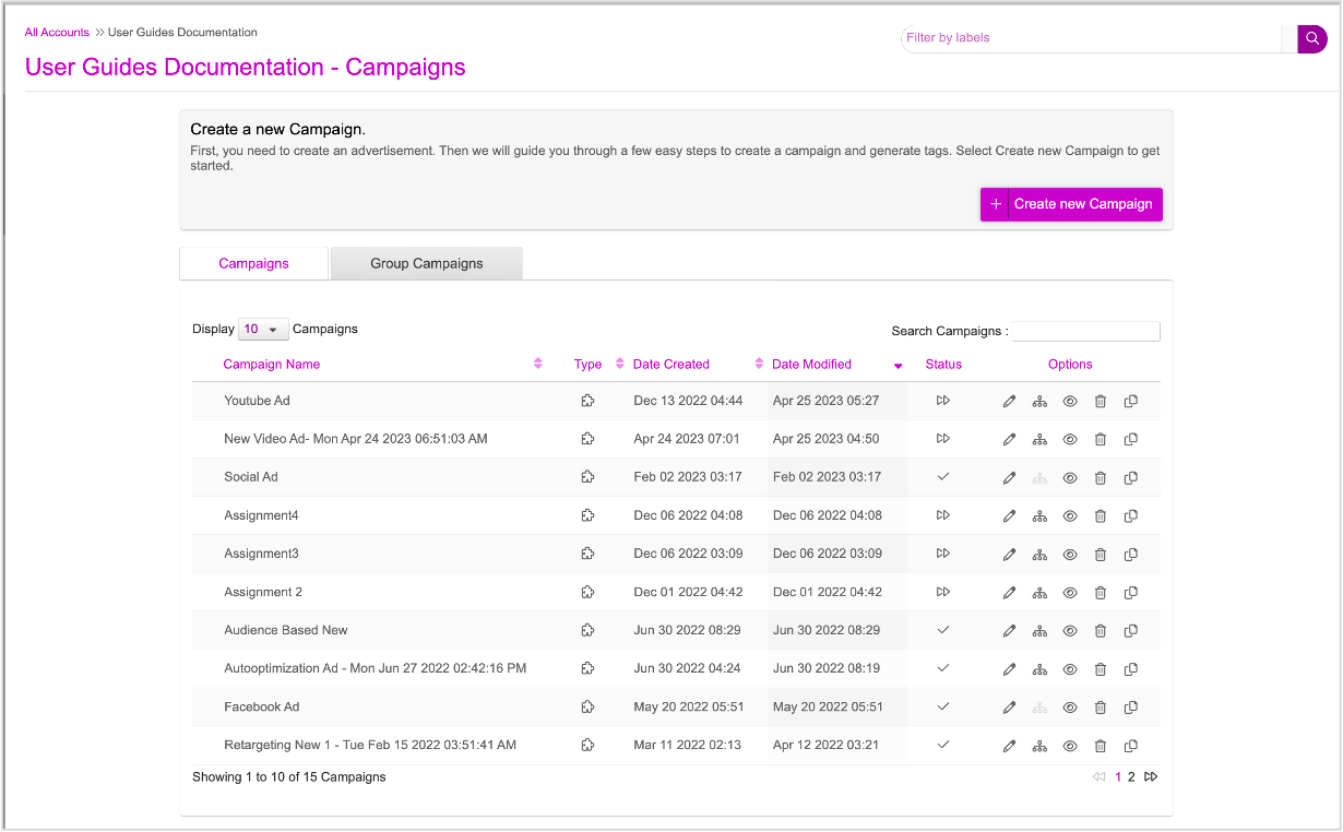 The campaign is saved and you will be redirected to the Campaigns dashboard page.