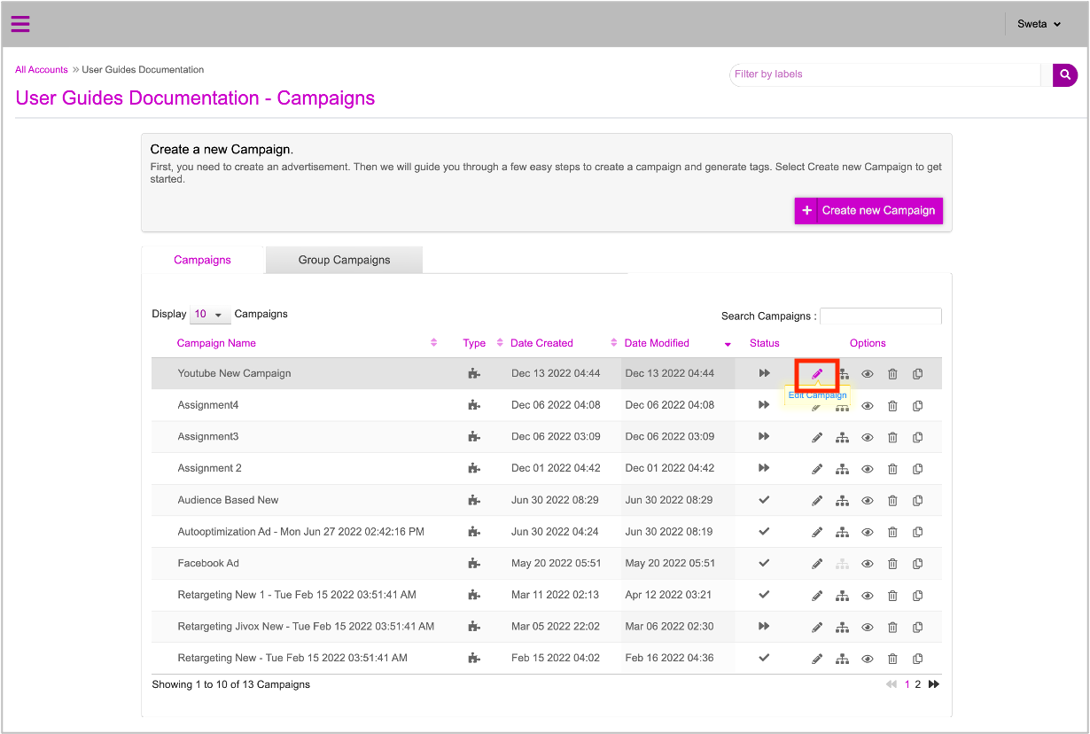 1- On the Campaigns Dashboard, let's click the pencil (Edit) icon next to the campaign that we just created.