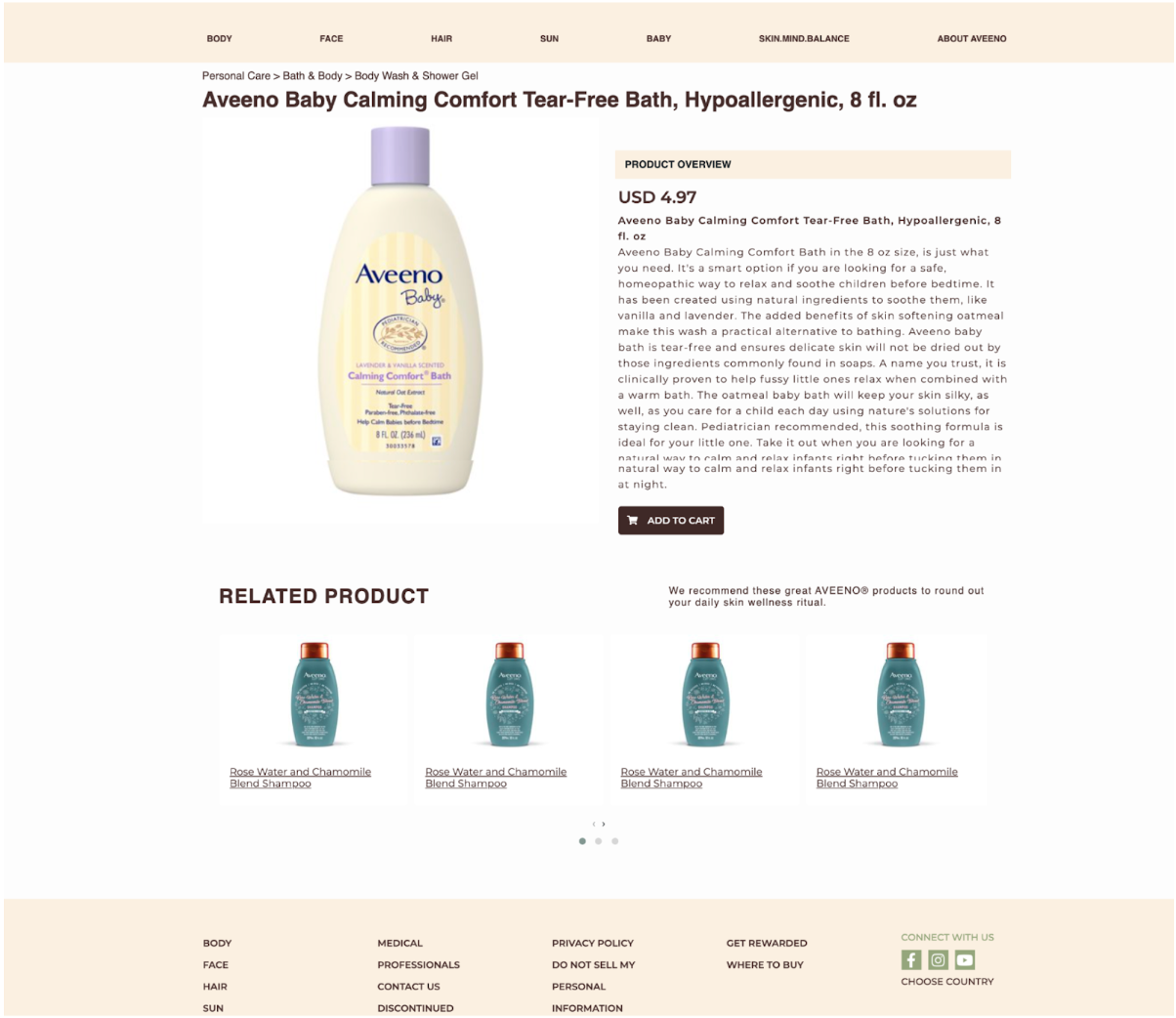 The product landing page consists of elements such as the product name, product image, descriptions, product specifications, product price, weight/size etc. along with a CTA button, in this case, Add to Cart. These details can vary from brand to brand. A set of related product recommendations are also displayed below the product details.