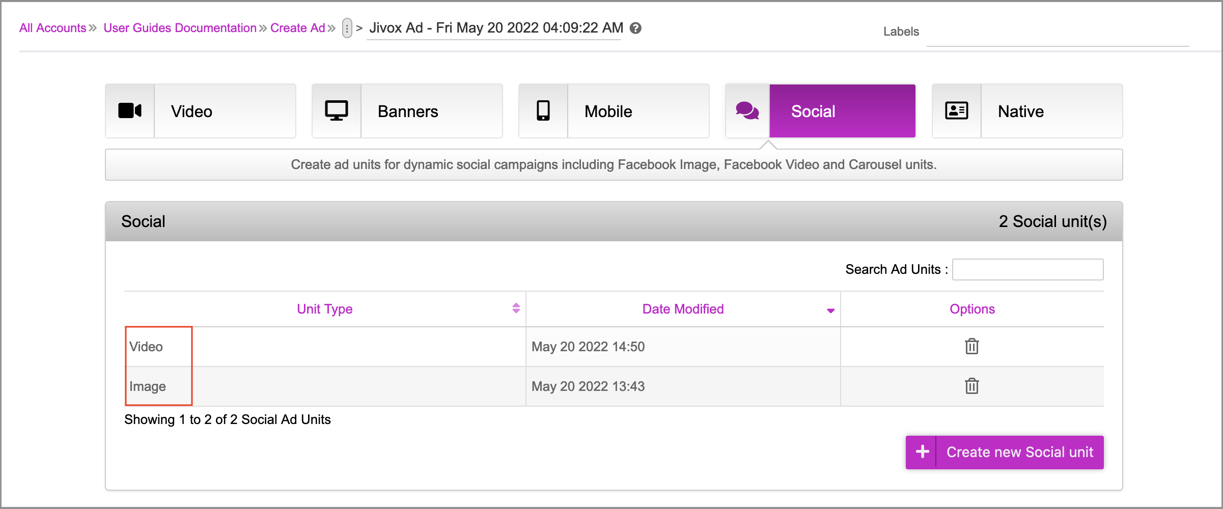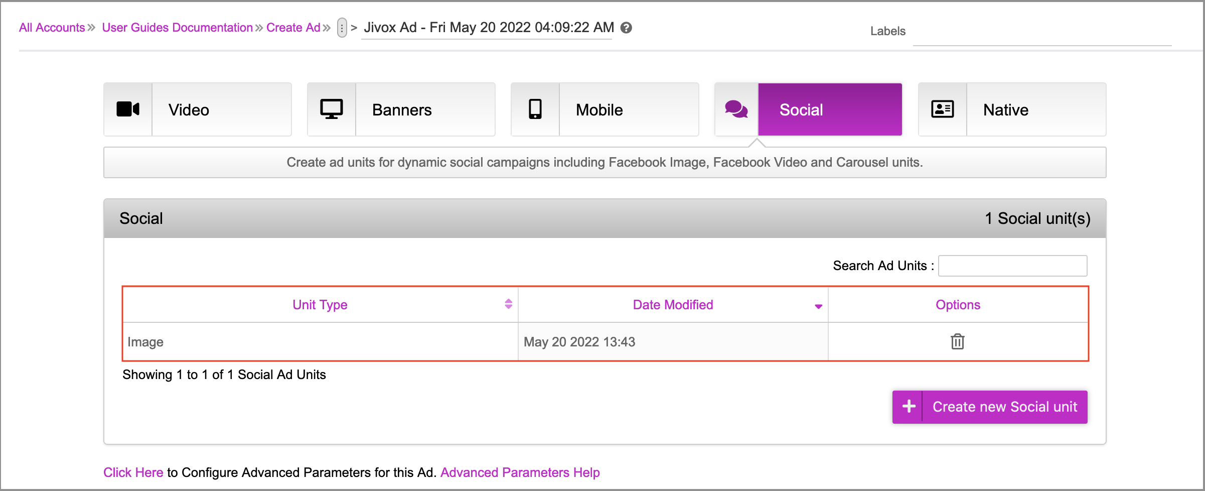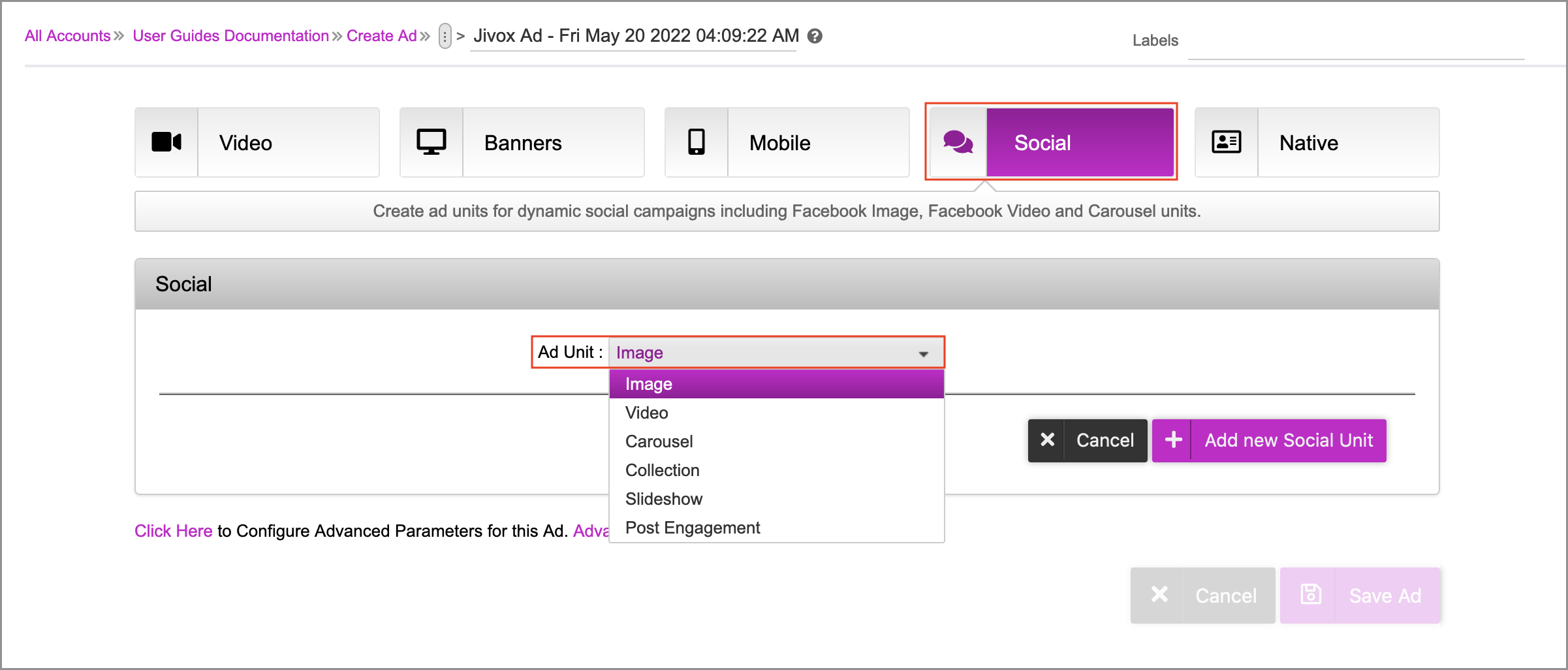 2- On the Create Ad page, click Social. From the Ad Unit dropdown, select the ad unit type based on your requirement.