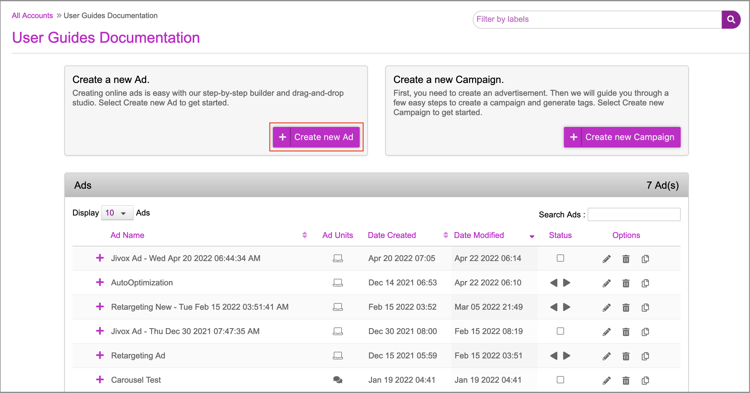 To get started, navigate to the Ads and Campaigns dashboard and follow these steps.