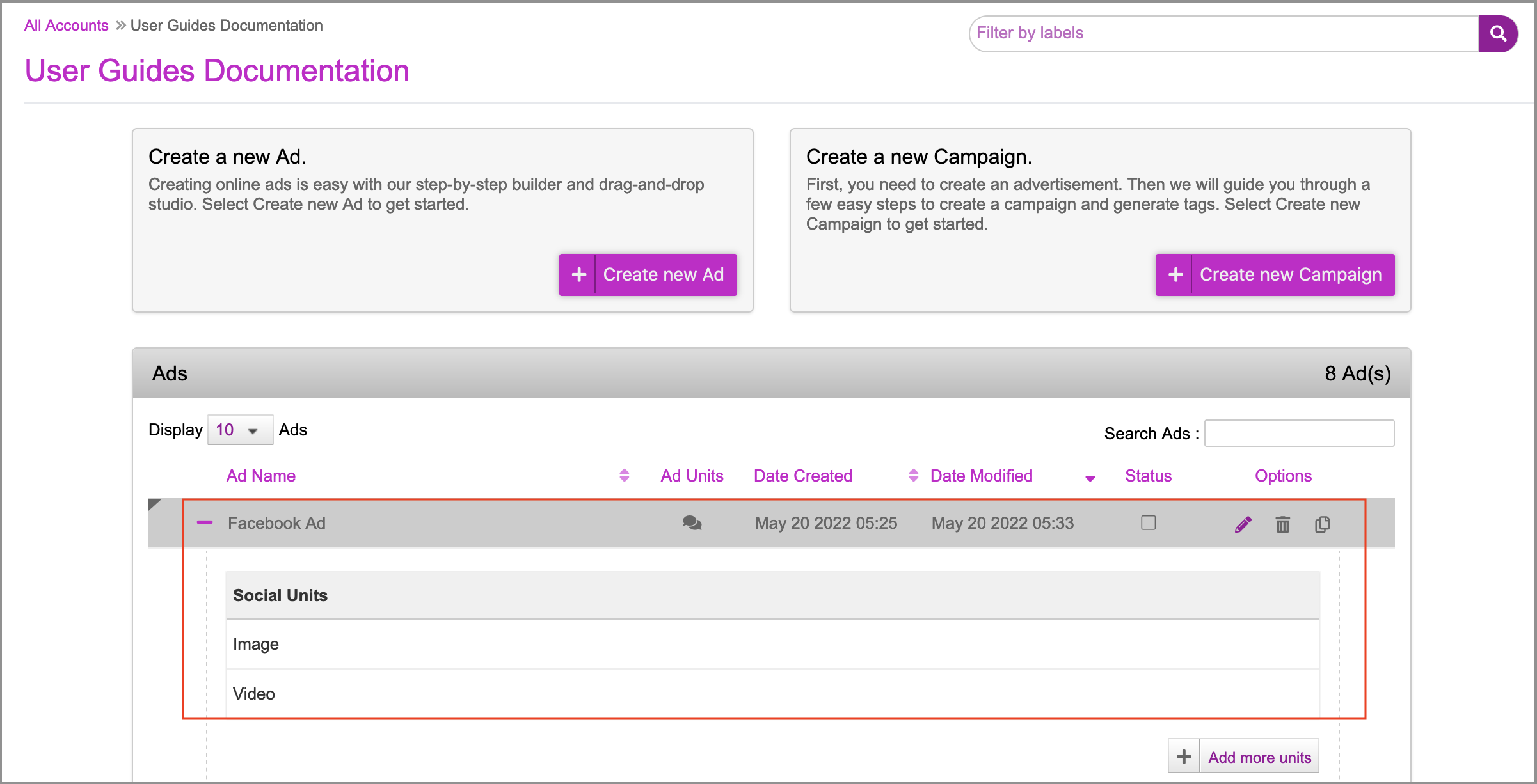 6- The ad will be displayed in the Ads section under Ad Name. This is the placeholder for all the different ad units created.