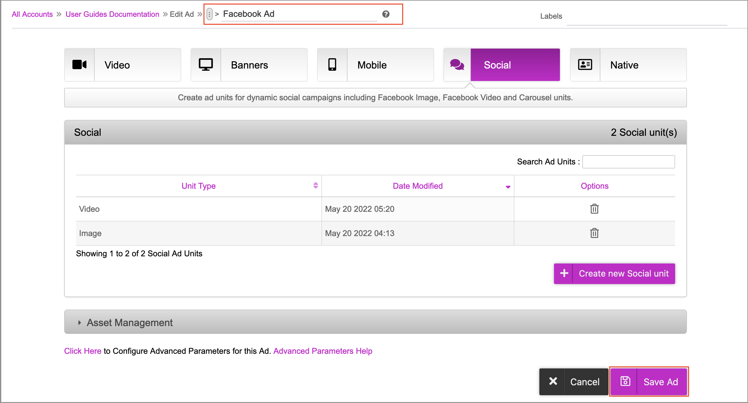 In this section, we will cover the ad creation process . This is a straight forward setup that allows you to create relevant ad units for your Facebook campaign. For example, if you were using only Image units in Facebook, you would select only a 'Image' Ad unit. However if you were to do both image and video units, you would select both 'Image' and 'Video' ad units.