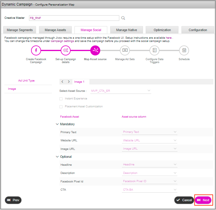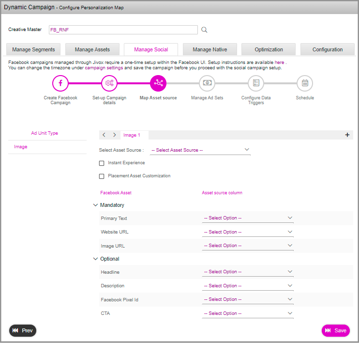 In the Map Asset Source section, you can map your asset source to the required Facebook components. The column on the left represents the Facebook columns whereas the column on the right with the drop-down list are derived from the Asset Source.