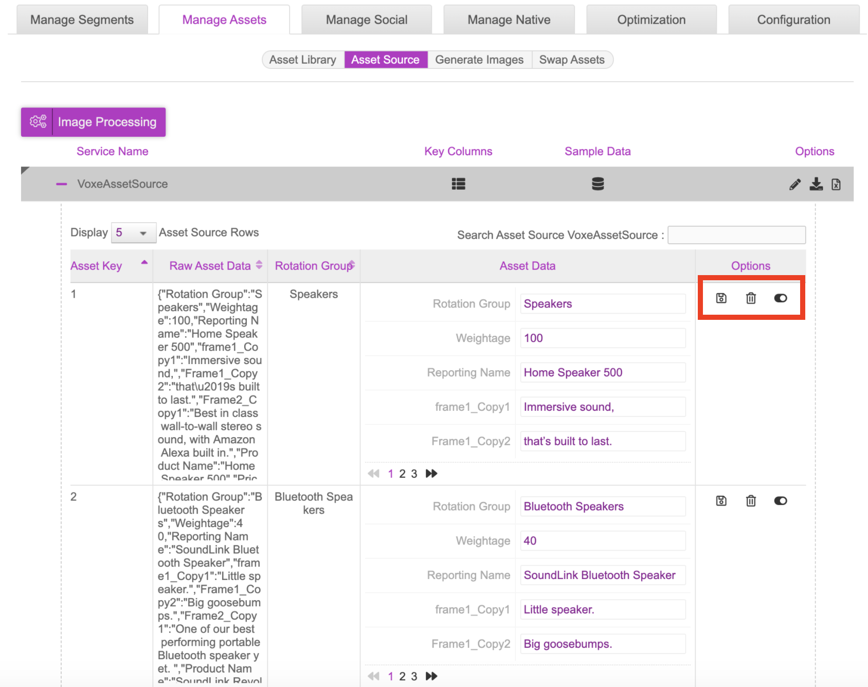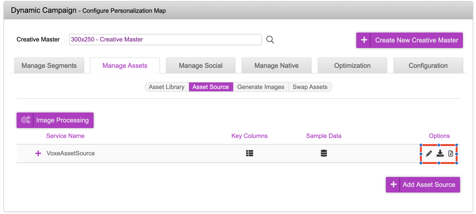 - You can view the asset source in the dashboard by clicking onto the plus icon. In this section you’re able to update, delete and deactivate rows here. Any changes made here will be reflected in real time so the creative versions being served will always be the most up to date.