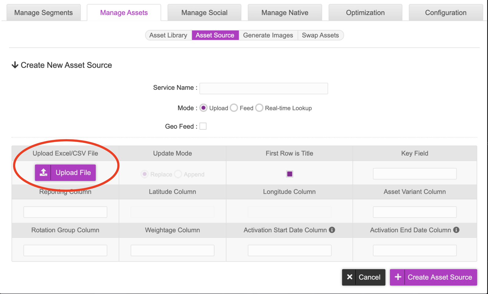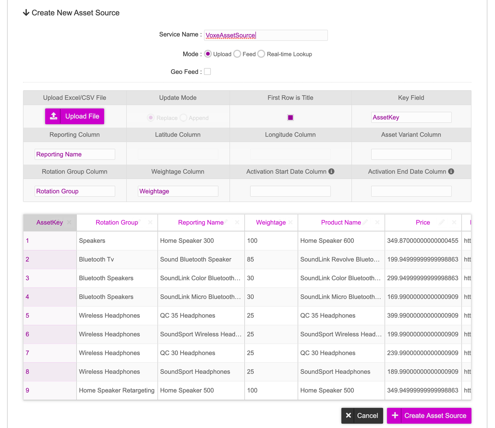 - Once you have uploaded the asset source, you will be shown a snippet of the Asset Source as a preview. This is where we will configure mapping our columns in our asset source to the fields here.