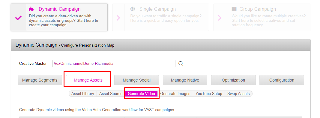 - Navigate to Manage Assets, and under the Manage Assets section, select Generate Video