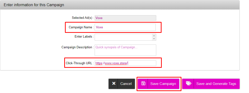 - Once the asset source has been uploaded, fill in the Campaign Name and Click-Through URL and click “Save Campaign.”