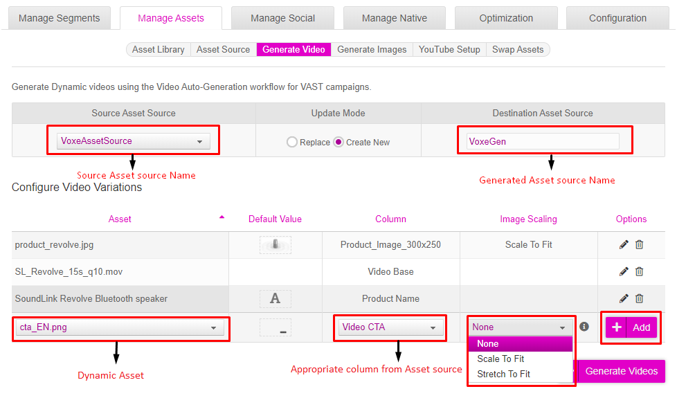 Note: The newly generated Asset Source will have the final videoURL column for all the variations. Please see the 2nd tab of the spreadsheet, column ‘I’.