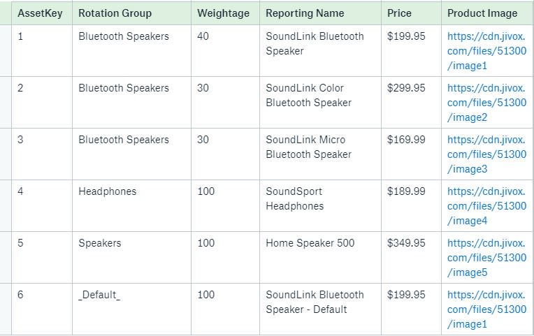 - The Rotation Group is now our key lookup value, these values don’t have to be unique. Multiple data triggers can be leveraged here (they’re configured in the decision graph, which we’ll discuss more further on). This also applies to the “Default" as it will now be within the Rotation Group column. To give an example, if the weather is 30 degrees and the user is in London, we’ll configure it so that ‘Bluetooth Speakers’ is assigned to it. If those conditions are met, the user will now be served a rotation of the creatives that belong to ‘Bluetooth Speakers’ Rotation Group. If there are 500 types of bluetooth speakers that you sell, they can all be assigned to the ‘Bluetooth Speakers’ group and rotate between the creatives shown. This is a how Jivox supports multivariate testing and analysis. JivoxIQ supports auto-optimization of creatives within a Rotation Group.