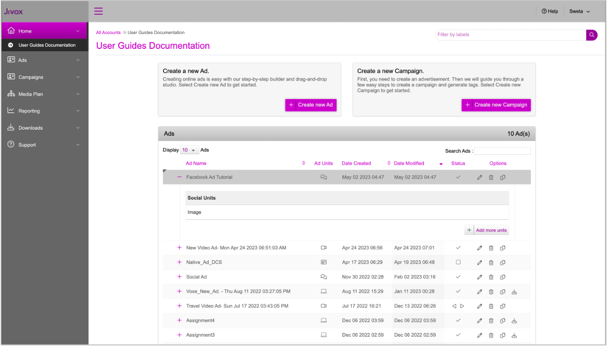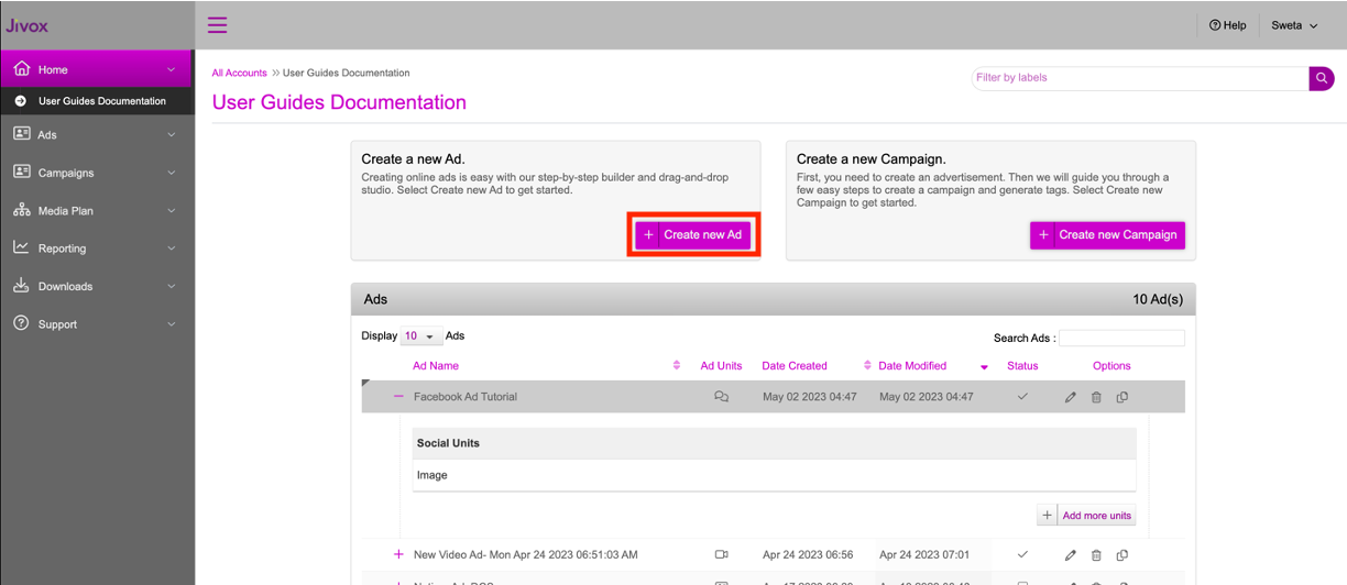Let's begin by navigating to the Ads and Campaigns listing page on the JivoxIQ platform. See here for details.