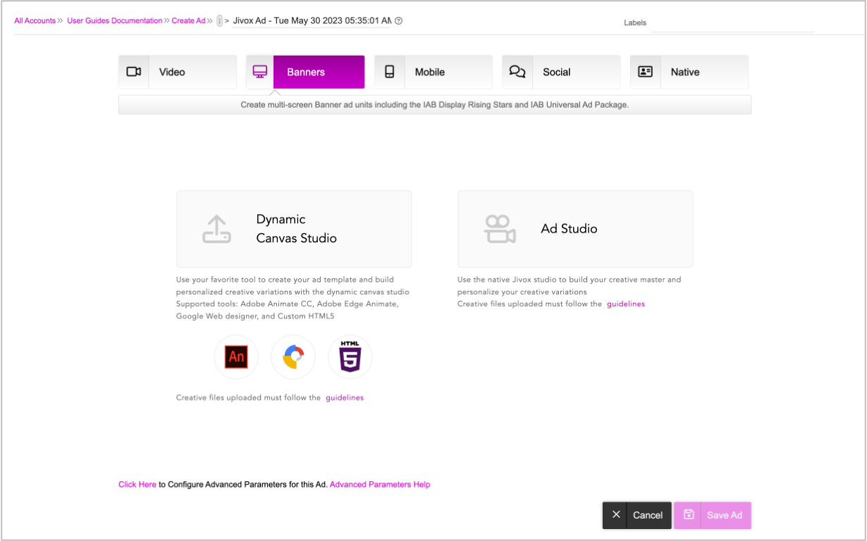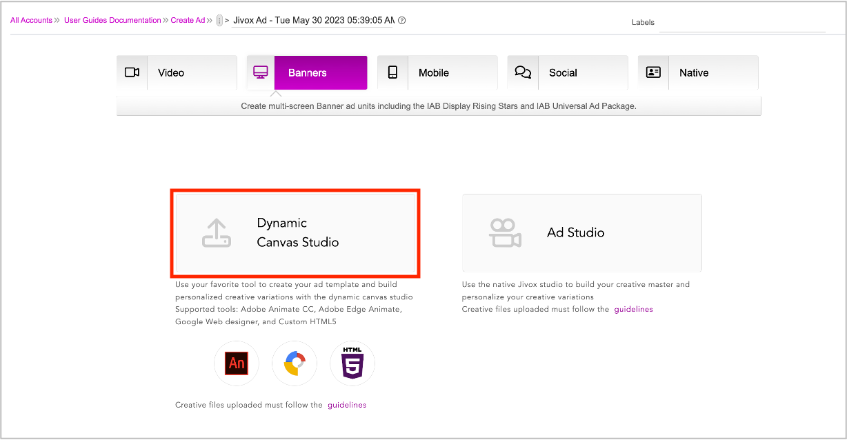 We recommend you use the Dynamic Canvas Studio for creating ads. However, if you want to use the classic Jivox Ad Studio framework, you can select Ad Studio. |