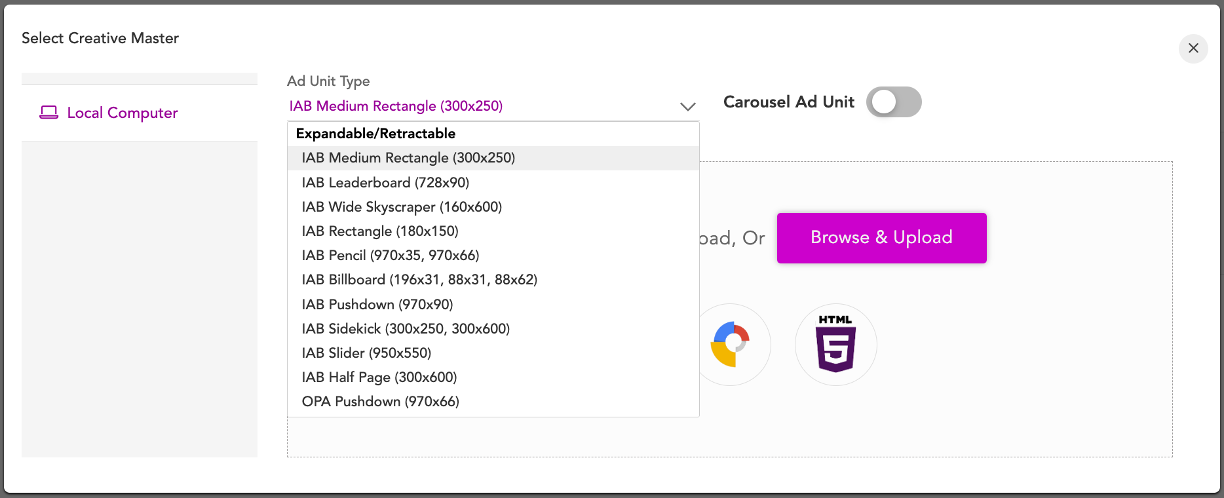 4- Select the Ad Unit Type from the drop-down. The drop-down lists all IAB standard ad units and other ad unit types.