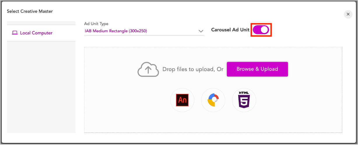 5- Select the This is a carousel Ad Unit button. Once the toggle button is enabled, the platform recognizes that the uploaded zip file is to be used for carousel ads.