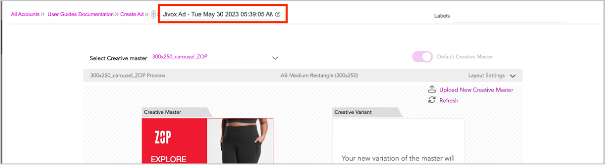 By default, the name given to a newly created ad unit is Jivox Ad with timestamp as a suffix. If you wish to change the default ad name, enter a unique name to identify the carousel ad unit at this point.