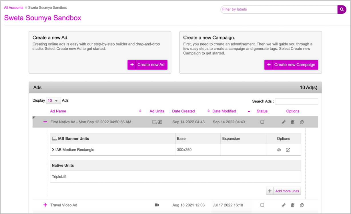 Now, click Save Ad to save the ad . You will be redirected to the Ads and Campaigns dashboard where the newly created Ad is displayed first.