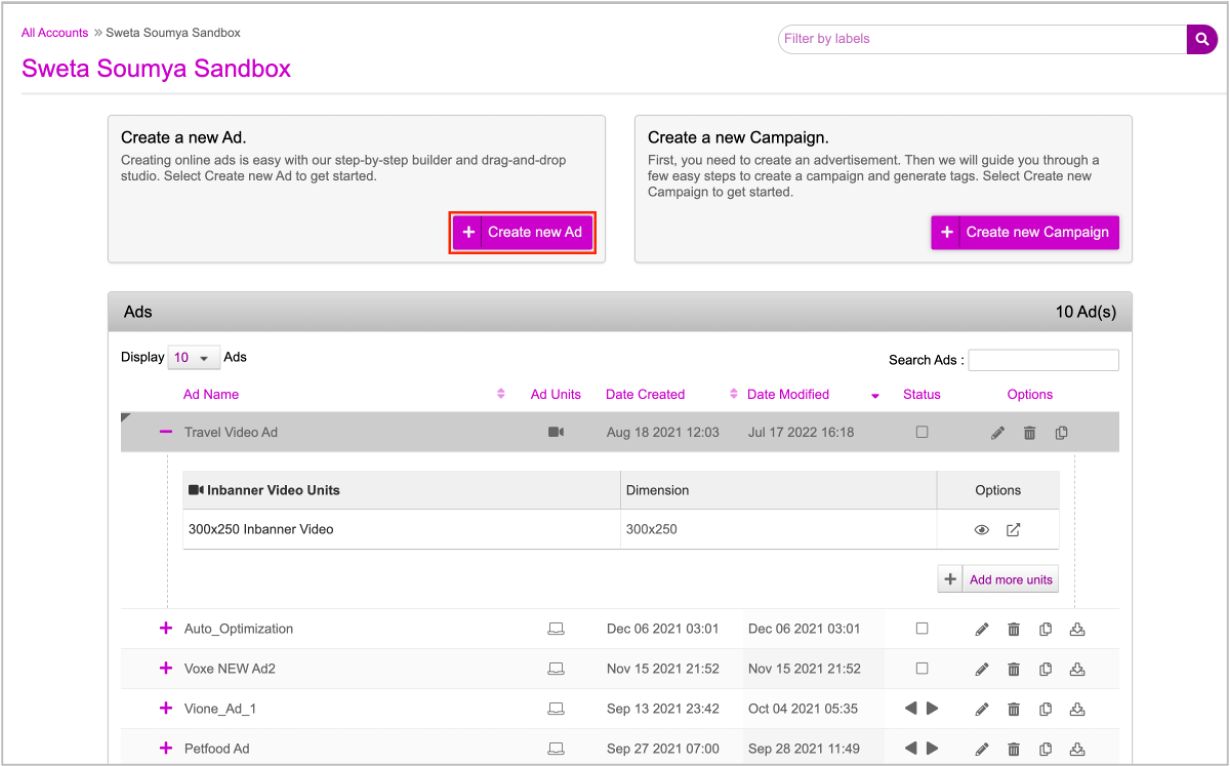Login to your account and navigate to the Ads and Campaigns dashboard. On the dashboard, click Create new Ad.