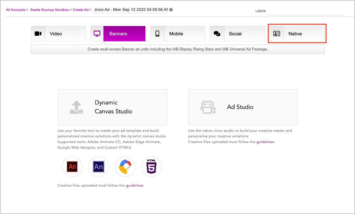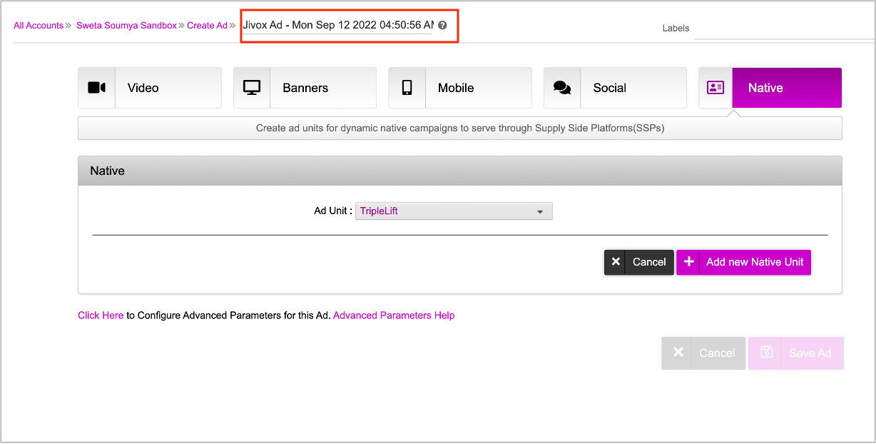 You will see the Native section with the option to select the Native Ad Unit type. The Ad is named Jivox Ad by default. You can rename it as required on the top bar as highlighted below.