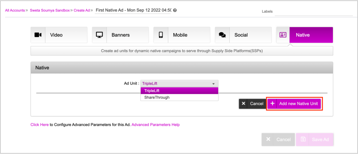 Select the partner that you want to work with and then click Add new Native Unit. The Ad Unit will be created.