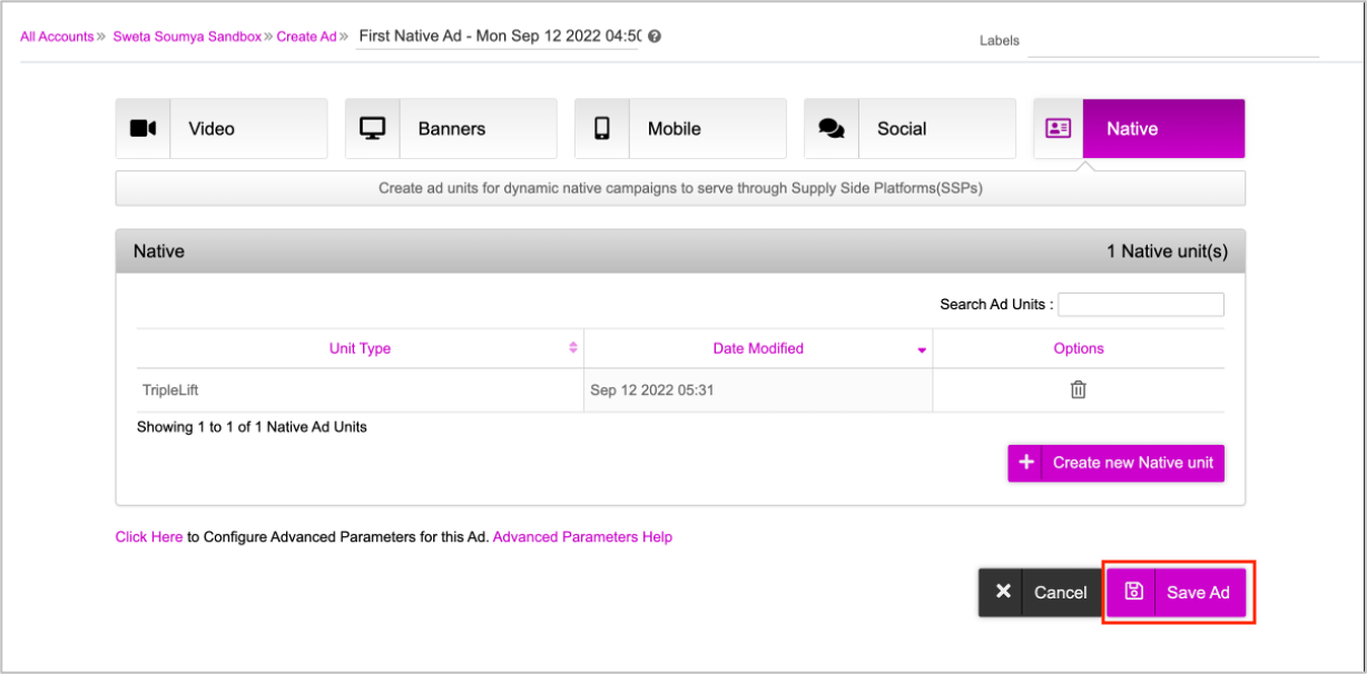 Here, we'll rename this to First Native Ad.